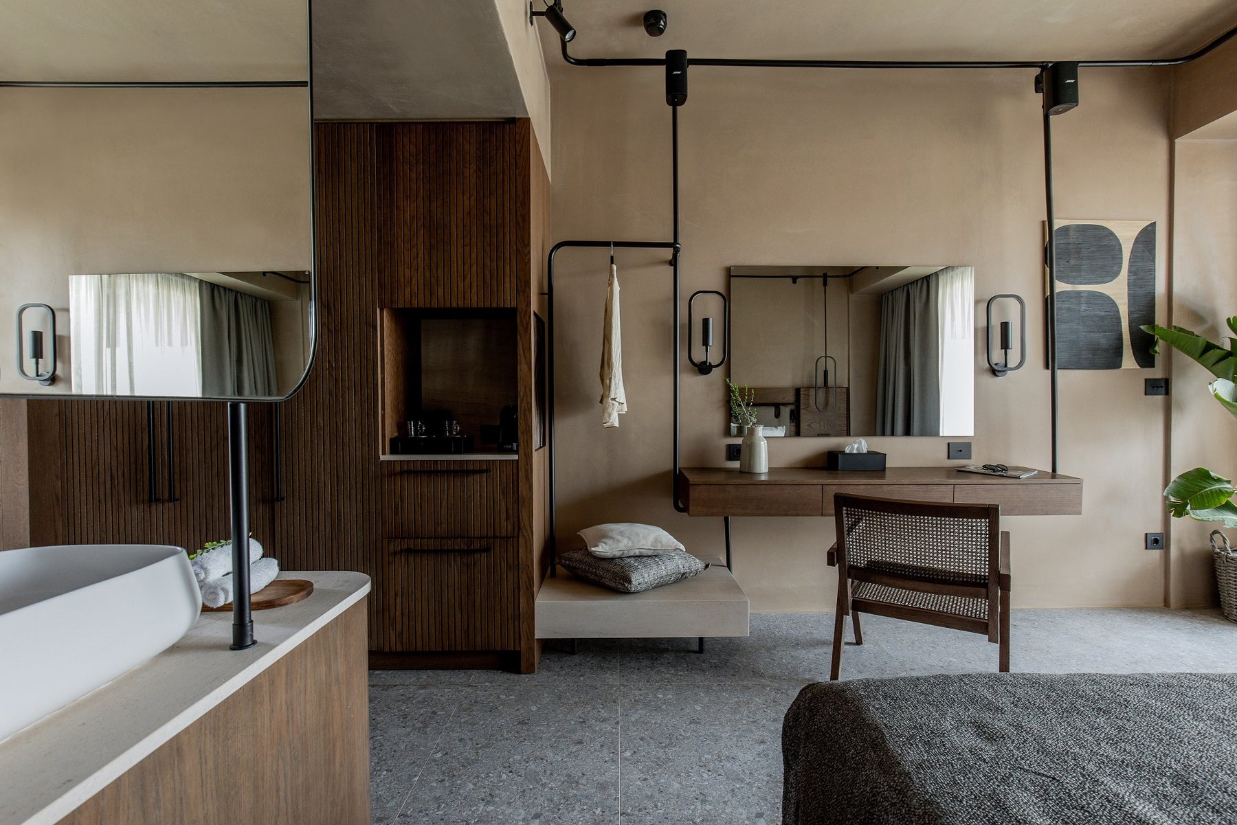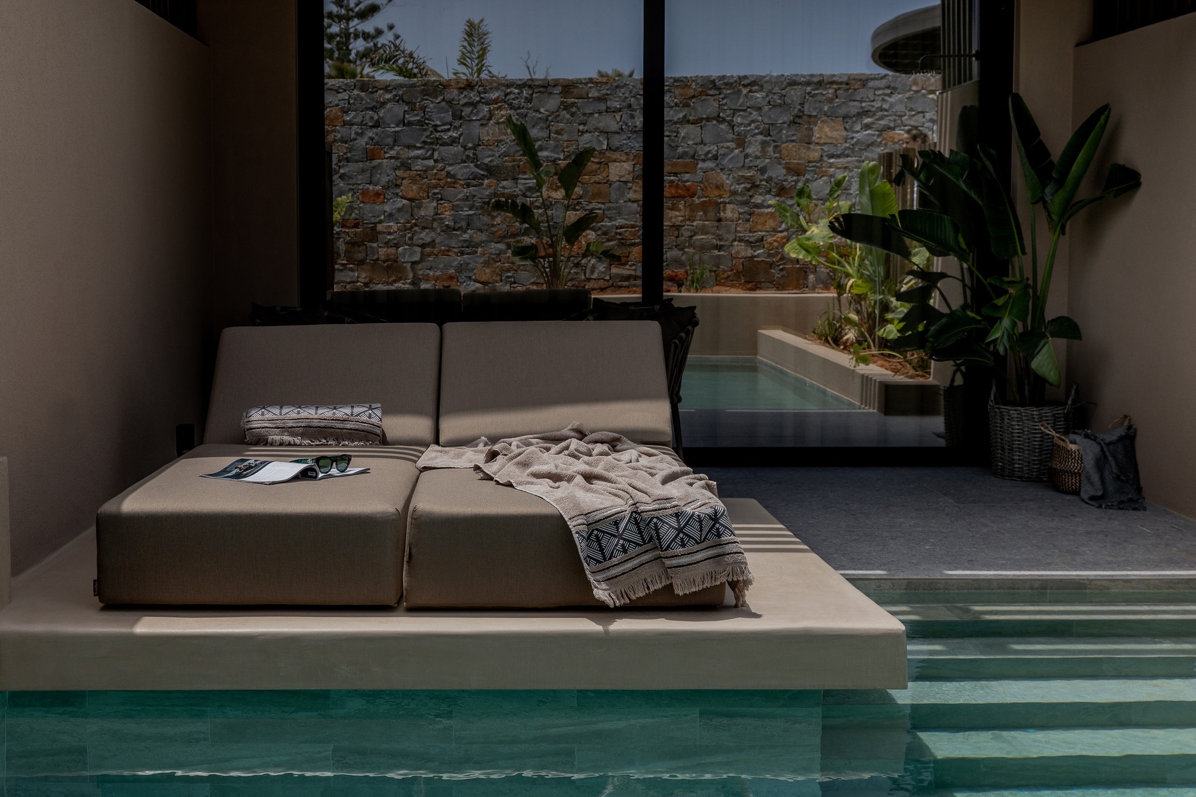Las habitaciones y suites del Hotel PNOI están diseñadas con un estilo cicládico moderno, combinando líneas limpias, materiales naturales y tonos suaves y neutros. Los tipos de habitaciones y suites incluyen: