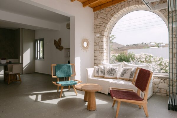 Las habitaciones y suites del Hotel PNOI están diseñadas con un estilo cicládico moderno, combinando líneas limpias, materiales naturales y tonos suaves y neutros. Los tipos de habitaciones y suites incluyen: